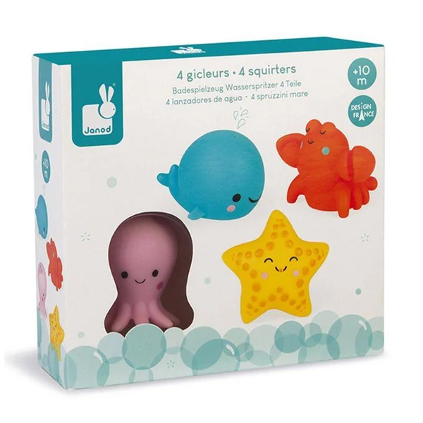 Votre enfant jouera dans son bain pendant des heures avec ces 4 animaux de la mer gicleurs : une pieuvre, un homard, une étoile de mer, une baleine.