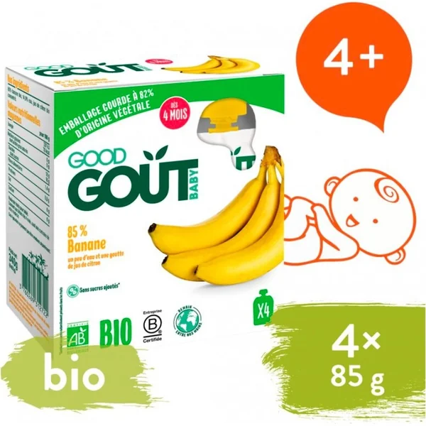 Alimentation infantile à partir de 4 mois. Purée de fruits pour une alimentation spéciale des nourrissons et des jeunes enfants. Pasteurisé. Cuit à la chaleur. Sans gluten. Cet emballage contient Good Gout BIO Banane (4×85 g)