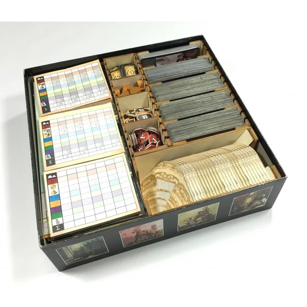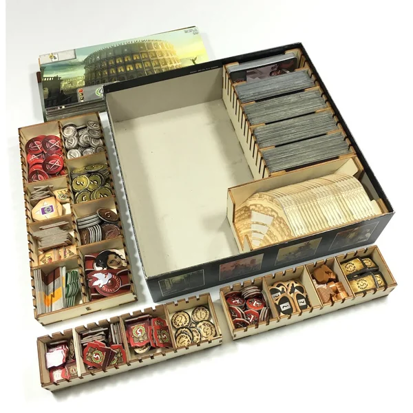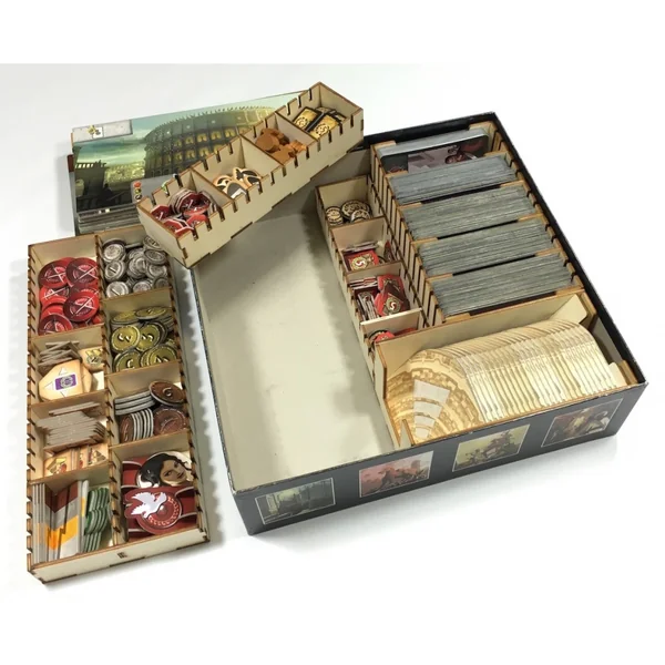 Un insert en bois qui s’adapte parfaitement à 7 Wonders première édition. Il peut également contenir Leaders, City, Babel and le Wonder pack. L’insert est divisée en zones amovibles contenant tous les éléments nécessaires au jeu, de sorte que le temps de mise en place et de rangement du jeu est réduit au minimum. Il peut également contenir une petite extension.