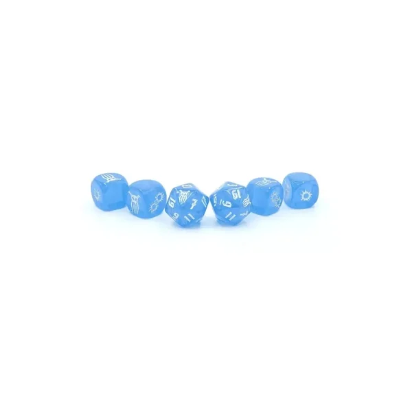 Ce paquet contient deux d20 et quatre dés de défi d6. Cristal bleu translucide avec numérotation blanche.
