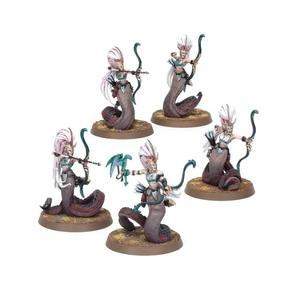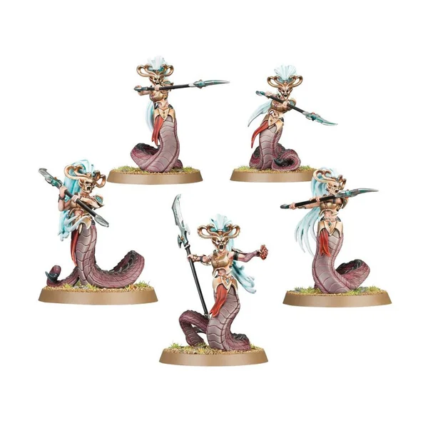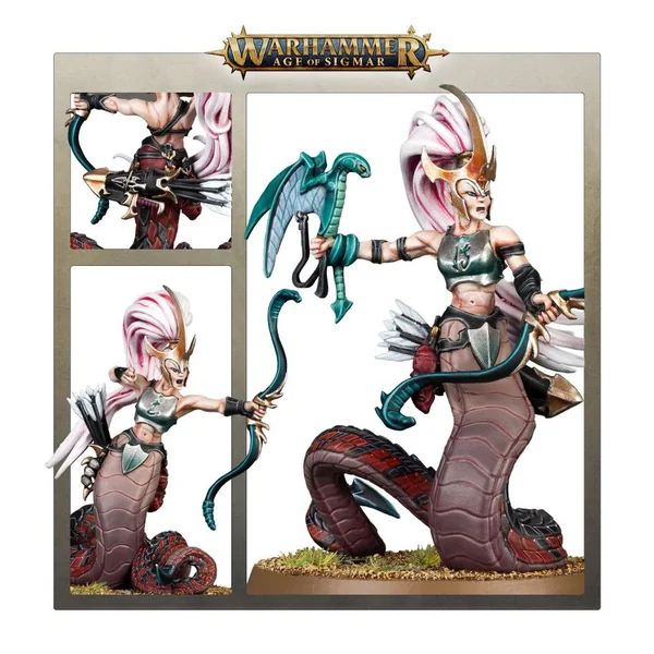 Ce kit plastique contient les composants nécessaires pour assembler 5 Blood Sisters. La première chose qu’on remarque chez ces figurines, c’est leurs jambes, ou l’absence d’icelles – modelées à l’image de leur créatrice Morathi, leur corps en-dessous du tronc est celui d’un horrible serpent. Par ailleurs, elles portent des plastrons de métal garnis de tassettes. Les Blood Sisters ont le visage entièrement caché par un masque de métal figé dans une expression furieuse et qui encadre de serpents leur chevelure tirée en arrière. On peut en option monter 1 figurine en tant que Gorgai, la chef d’unité: elle se distingue par son masque orné de joyaux, son vouge brisecœur différent et son affreux trophée – le cœur d’une malheureuse victime, qu’elle serre fièrement dans sa main gauche.