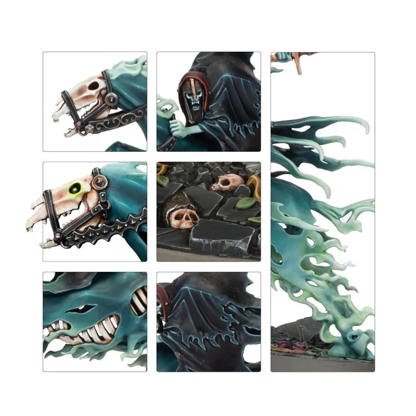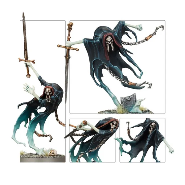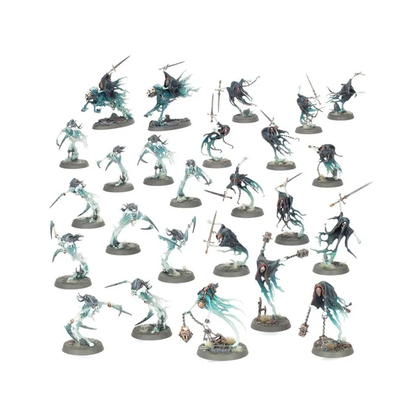 Si votre but est de grossir les rangs des serviteurs de Nagash en pillant des âmes, cette boîte est le moyen idéal d’entamer une nouvelle collection de Hantenuits ou d’agrandir une armée existante tout en faisant des économies par rapport à un achat des kits au détail. Cette force s’articule autour d’un Esprit Tourmenteur protégé par une paire de Mânes Enchaînés. Des Revenants Lamemânes et des Carognes Faucheuses submergent l’ennemi sous leurs rangs flottants et s’emparent des objectifs cruciaux, tandis qu’un duo d’Écumeurs Affrelames montés vient achever les unités ennemies affaiblies, s’emparer des objectifs non protégés et apporter son soutien là où c’est nécessaire. Ces figurines composent une force de Fer de Lance complète, ce qui vous permet de jouer rapidement des parties réduites et tactiques et ainsi vous venger des vivants avec le contenu de cette seule boîte.