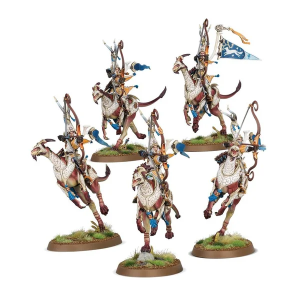 En tant qu’archers montés parmi les plus éminents des Royaumes Mortels, ces guerriers sans pareils sont aussi à l’aise pour tirer au galop que pour se ruer en mêlée. Leurs treerunners sont si agiles qu’ils négocient le terrain le plus dense comme s’il n’était pas là, ce qui rend cette cavalerie excellent pour déborder les flancs.