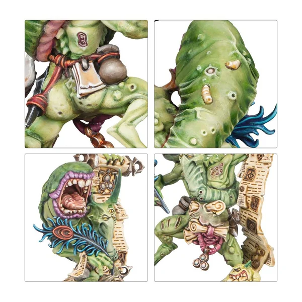 Les Pustules sont une infâme intendance de Portepestes chargés de répandre les maladies les plus virulentes dans toutes les terres qui attendent de recevoir la bénédiction du Grand-Père. Accompagnés d’une énorme Gueule Noueuse Immonde et menés par un Scribe Avarieur, ils ensemencent le sol d’une abondante contagion tout en répertoriant les fléaux déchaînés par leurs efforts assidus.