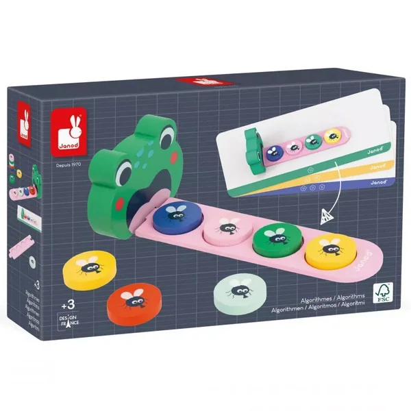 L’heure du déjeuner a sonné pour Froggy la grenouille gourmande. Mais attention, il est important de bien disposer les mouches sur sa langue afin de varier son repas…! 2 modes de jeu sont proposés. Le premier est un atelier autonome durant lequel votre enfant doit reproduire une suite logique de couleurs en suivant les images des cartes. Le second mode de jeu est un atelier duo : il permet d’accompagner votre enfant dans l’apprentissage des algorithmes, tout en partageant un moment amusant. En déposant des mouches sur la langue de la grenouille, votre enfant apprendra à reproduire et identifier une suite logique de couleurs tout en s’amusant.