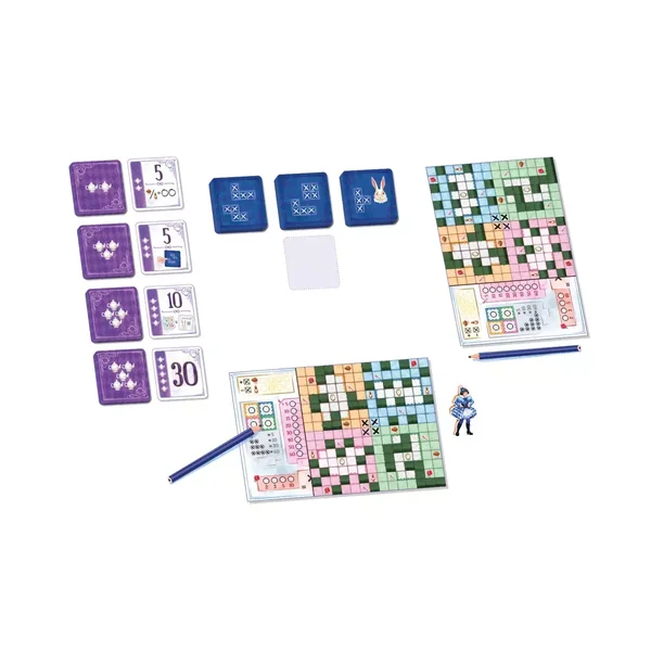 Alice est un jeu à cocher compétitif où chaque joueur doit reproduire sur sa fiche les formes révélées au centre de la table.
