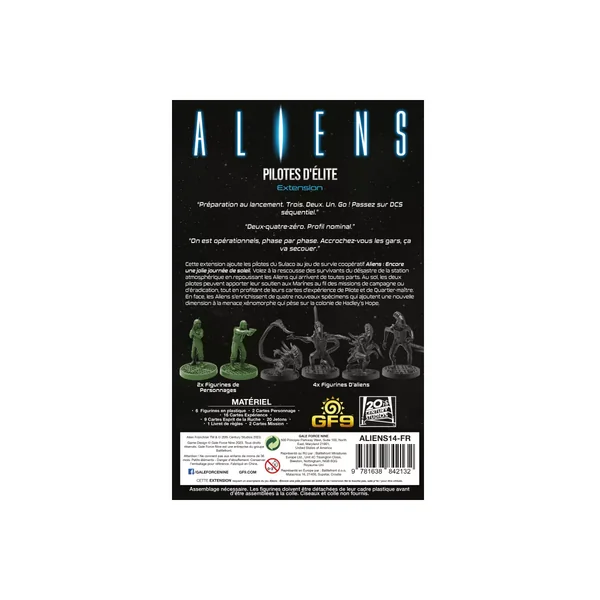 L’extension Aliens : Pilotes d’Élite contient : 6 Figurines en plastique 2 Cartes Personnage, 16 Cartes Expérience, 9 Cartes Esprit de la Ruche, 20 Jetons, 2 Cartes Mission, 1 Livret de règles.