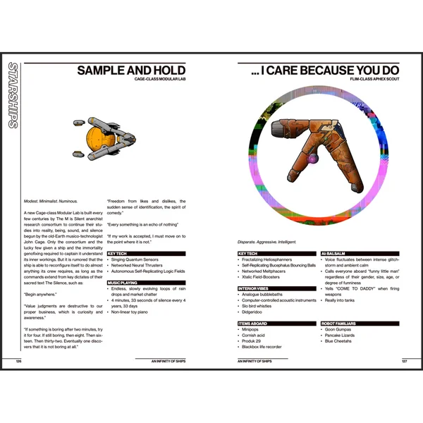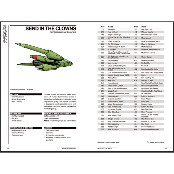 - DES TABLES ! Couvrant tout, des noms et classes de vaisseaux aux technologies expérimentales, personnalités d’IA, genres musicaux du lointain futur et équipages de robots étranges.