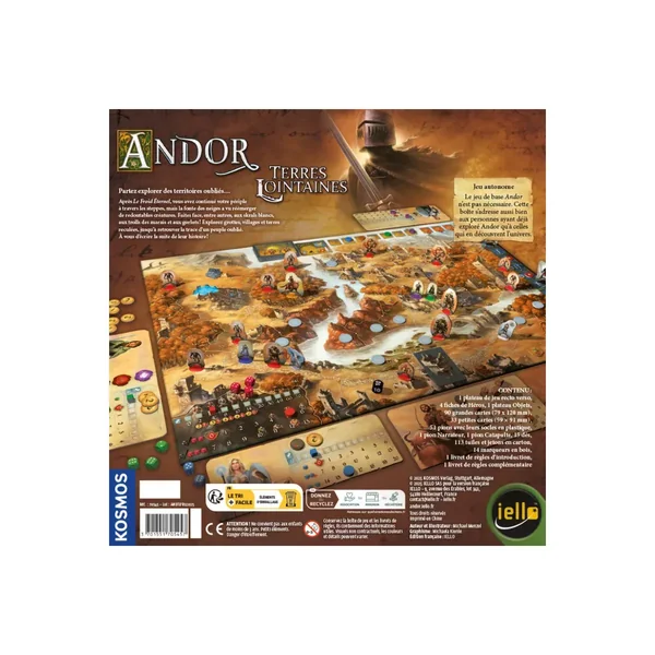 Dans Andor : Terres Lointaines, les héros poursuivent leur périple dans des contrées encore inexplorées, peuplées de créatures hostiles et de mystères à élucider. Ce jeu coopératif vous invite à vivre une série de sept légendes scénarisées, chacune proposant ses propres objectifs, événements et défis.