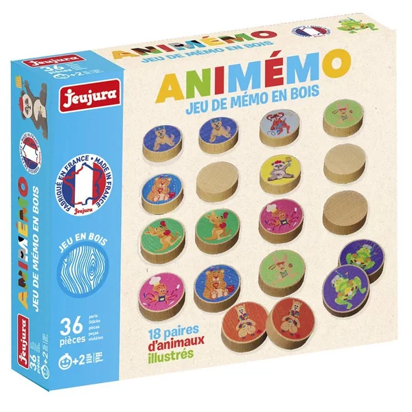 Ce jeu de mémo sur le thème des animaux se compose de 36 gros palets en bois (diamètre 4 cm x 1,2 cm) de 18 paires d’animaux illustrés et une règle du jeu.