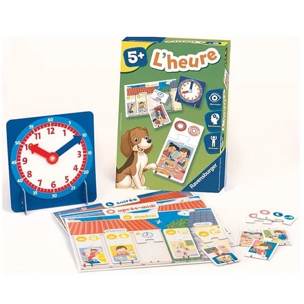 Grâce au jeu de L’heure, il est invité à acquérir ces notions tout en s’amusant ! A travers plusieurs modes de jeu évolutifs, l’enfant s’amuse à associer une série de pictogrammes et d’horloges à de petites scènes illustrées, avant d’en reconstituer la chronologie.Grâce aux pièces de puzzle autocorrectives et aux grandes planches « matin », « après-midi » et « soir », il avance dans le jeu à son propre rythme et peut vérifier lui-même ses réponses. A chaque étape, il joue à tourner les aiguilles de la grande horloge et apprend petit à petit à déchiffrer l’heure. Ce jeu favorise ainsi la compréhension de la notion du temps, l’apprentissage de la lecture de l’heure analogique, digitale et littérale et la capacité de raisonnement. Dès 5 ans.