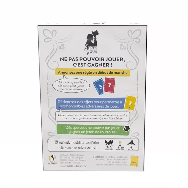 Après Vous est un jeu où la courtoisie est au cœur de la stratégie… ou presque. À chaque manche, le joueur détenteur du jeton de bienséance énonce une règle que tous doivent suivre pour poser une carte. Si un joueur ne peut pas jouer, il s’en excuse (poliment !) et gagne un jeton de courtoisie.