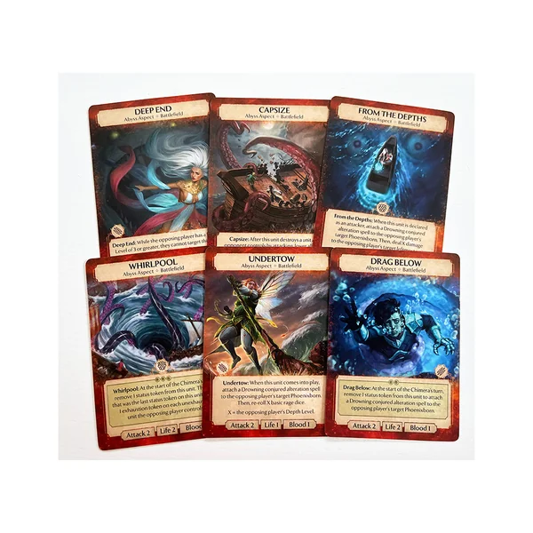 Choisissez parmi quatre Phoenixborn : Namine, Echo, Harold et Fiona — chacun maniant une toute nouvelle carte signature. Utilisez le nouveau deck de magie de la sympathie inclus pour prendre la mer et affronter le mal qui rôde dans les flots ! Mais gardez un œil sur la lune, car cet astre céleste confère sa puissance à cette nouvelle abomination, qui déchaînera d’horribles attaques contre vos Phoenixborn en difficulté !