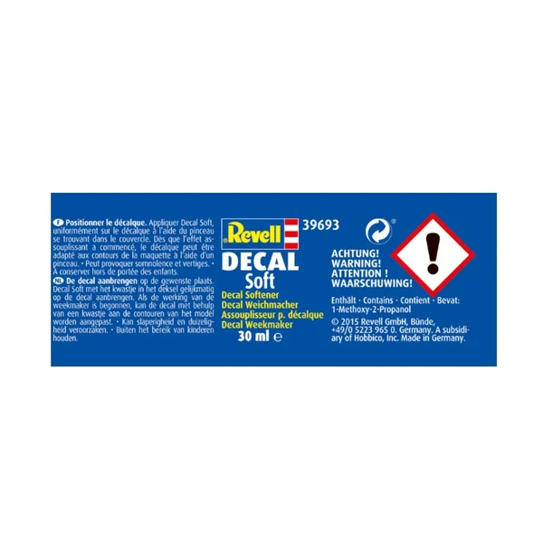 Revell Decal Soft est le plastifiant idéal pour adapter sans effort les décalcomanies aux contours de vos maquettes. Grâce à sa formulation spéciale, les décalcomanies deviennent plus flexibles, de sorte qu’elles se nichent parfaitement sur n’importe quelle surface sans déchirures ni plis.