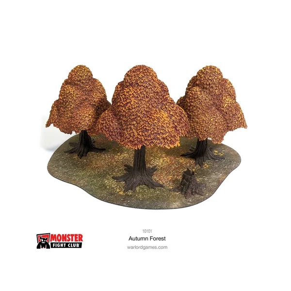Le set Autumn Forest contient trois arbres prépeints, avec des canopées oranges amovibles, une souche et un gabarit de sol forestier en néoprène à deux faces.
