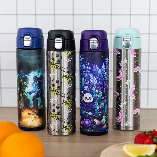 • La bouteille d’une capacité de 450 ml est disponible dans plusieurs designs ludiques qui peuvent être assortis au reste du matériel scolaire.