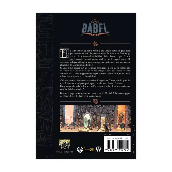 L’écran du jeu de rôle Babel (4 volets, souple) est accompagné d’un livret contenant dix nouveaux Cercles et un scénario.