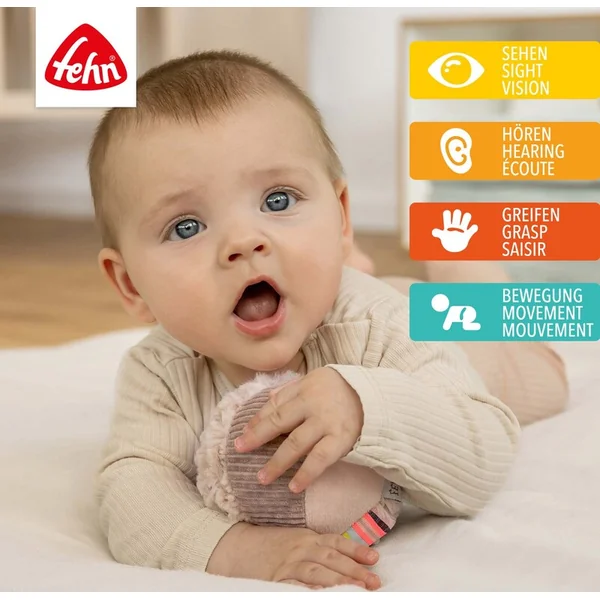 Rouler, secouer, déplacer – avec la douce balle de la collection Lazy, Crazy & Pink de Fehn, les bébés apprennent de manière ludique à découvrir le monde. La petite balle douce roule et le hochet à l’intérieur attire l’attention de l’enfant avec un son joyeux, qui suit le mouvement avec un grand intérêt. La balle douce aide à développer les compétences motrices, la coordination œil-main et l’agilité, car elle motive à ramper, lancer et attraper.
