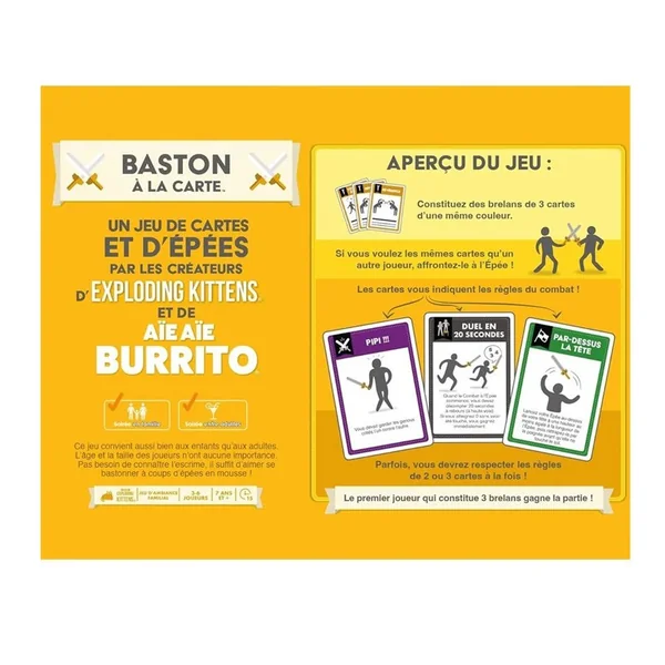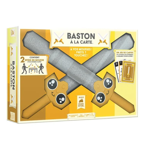 Baston à la Carte est facile à apprendre, rapide à jouer et hilarant à regarder. Apportez-le pour vos événements en plein air, à vos soirées de jeux en famille ou à tout autre endroit où vous devez régler des différends entre adultes (des adultes avec des épées !).