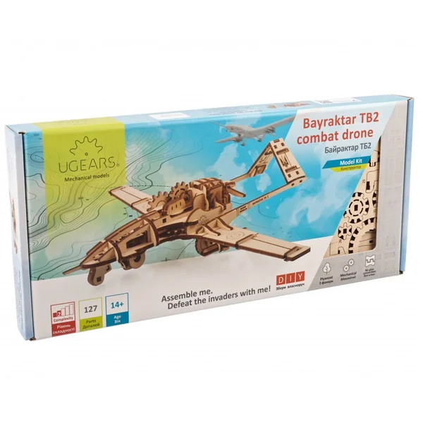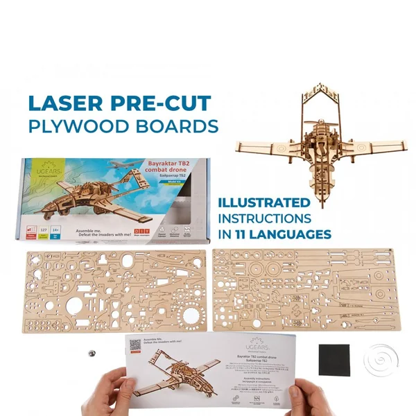 Bayraktar TB2 fait partie intégrante de la nouvelle ligne de modèles ZSU d’Ugears, créée pour inspirer les gens dans les moments difficiles. Comme toute la gamme exceptionnelle de puzzles 3D, de kits de modélisme, d’automates, de robots, de boîtes puzzle en bois et de kits de modélisme STEM Lab Ugears, le drone de combat Bayraktar TB2 s’assemble sans colle ni outils spéciaux. Il suffit de détacher les pièces des planches prédécoupées au laser et de les assembler en suivant nos instructions illustrées étape par étape en 11 langues (anglais, ukrainien, allemand, espagnol, français, italien, turc, polonais, japonais, chinois et coréen).
