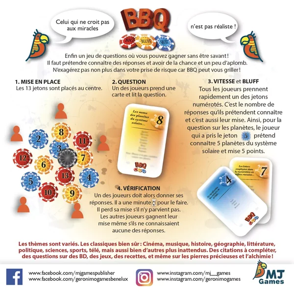Dans BBQ – Big Bluff Quiz, n’exagérez pas dans votre prise de risque car BBQ peut vous griller ! Les thèmes sont variés. Les classiques bien sûr : Cinéma, musique, histoire, géographie, littérature, politique, sciences, sports, télé, mais aussi bien d’autres plus inattendus, comme des citations à compléter, des questions sur des BD, des jeux, des recettes, et même sur les pierres précieuses et l’alchimie !