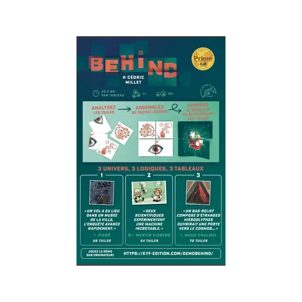 Behind est un jeu de logique et d’observation, solitaire ou coopératif, dès 10 ans, pour des parties de 45 minutes environ. Édité par Kyf Edition, il est conçu par Cédric Millet (Meeple Circus, Kyoto no Neko).