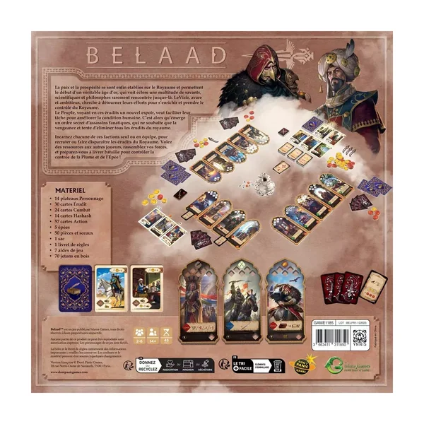 Belaad : La Contrée de la Plume et de l’Epée est un jeu de société jouable de 2 à 6 joueurs, dès 10 ans pour des parties de 45 minutes, édité par Don’t Panic Games.