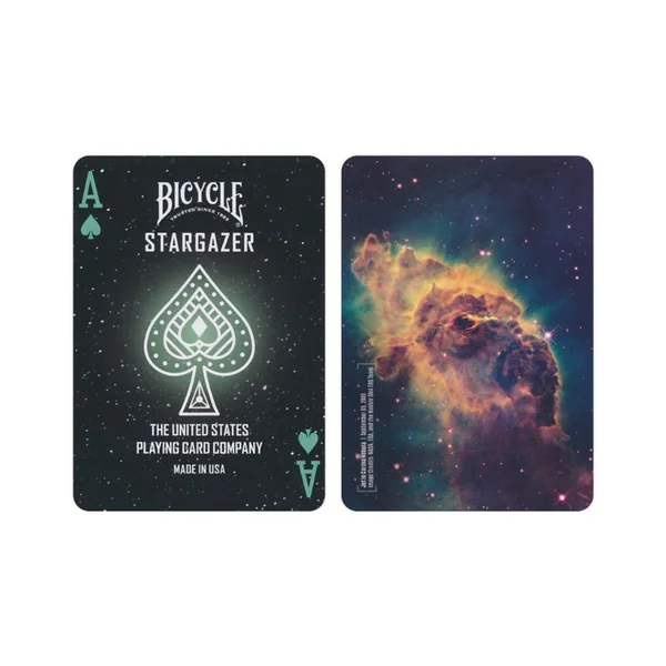 Embarquez pour une aventure cosmique avec les cartes à jouer Bicycle Stargazer 203 ! Admirez le spectaculaire « Jet de la nébuleuse de la Carène » reproduit au dos de chaque carte, à partir de photographies prises par le télescope Hubble le 9 septembre 2009. Avec leurs figures inspirées des constellations et leur étui orné d’un motif en feuille verte, ces cartes vous feront distribuer un véritable univers de divertissement.