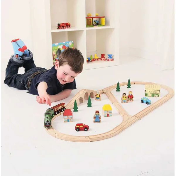 Les passagers peuvent acheter un billet à la gare rétro et monter à bord de ce magnifique train. Ainsi, ils peuvent profiter d’une excursion le long de la voie, en montant et en descendant, à travers des viaducs et des paysages naturels, y compris des maisons et des voitures le long du chemin. Cet ensemble ferroviaire en bois magnifique est idéal pour les amateurs de trains et aide à encourager des jeux créatifs et imaginatifs.