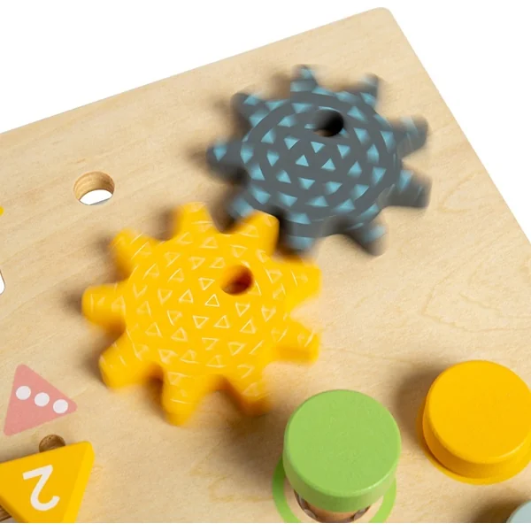 Elle offre de nombreuses activités amusantes que les enfants peuvent entreprendre, comme enfoncer des clous, visser des vis avec des têtes d’animaux, faire tourner des roues dentées en bois, ou glisser quatre triangles numérotés dans les bonnes ouvertures. Fabriqué en bois certifié FSC®.