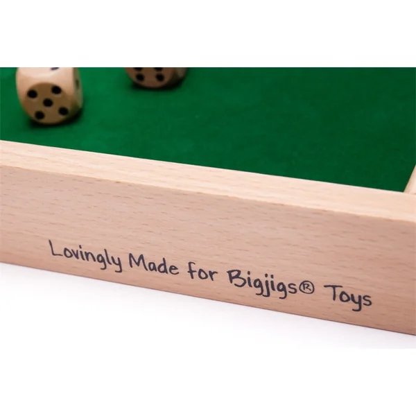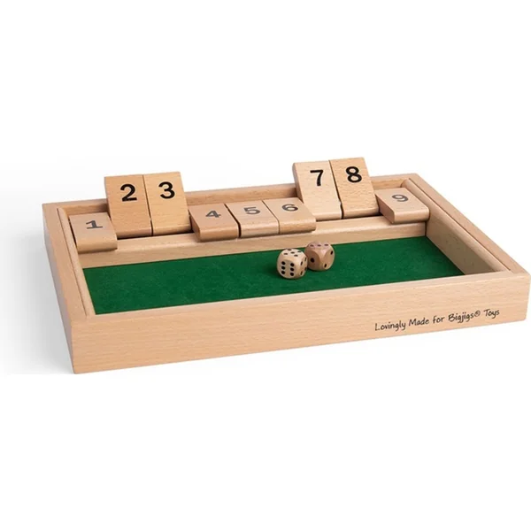 Un jeu amusant qui améliore les compétences numériques des enfants. Lancez une paire de dés et fermez les plaques (maximum deux) qui correspondent au total des lancers de dés. Continuez à jouer tant qu’il n’est plus possible de fermer d’autres plaques. Notez la somme restante des plaques non retournées. Le jeu se joue jusqu’à un nombre déterminé de points de pénalité, généralement jusqu’à 200, et le joueur avec le plus petit nombre de points de pénalité gagne. Un jeu éducatif et amusant, qui peut être joué par un ou plusieurs joueurs. Cette version en bois du jeu est fabriquée dans un cadre en bois traditionnel avec un plateau de jeu en feutre.