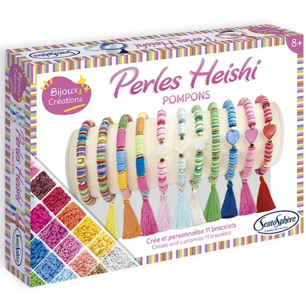 Plus de 1400 perles heishi, déclinées en 18 couleurs, pour réaliser plus de 10 bracelets qui seront ornés de jolies perles dorées, nacrées et de 10 pompons.