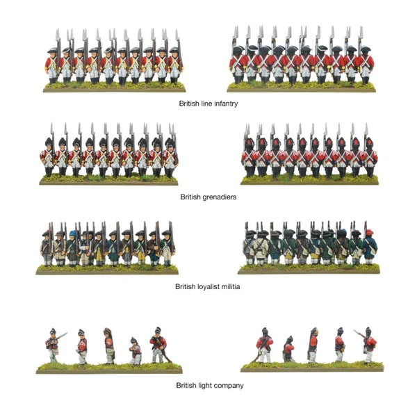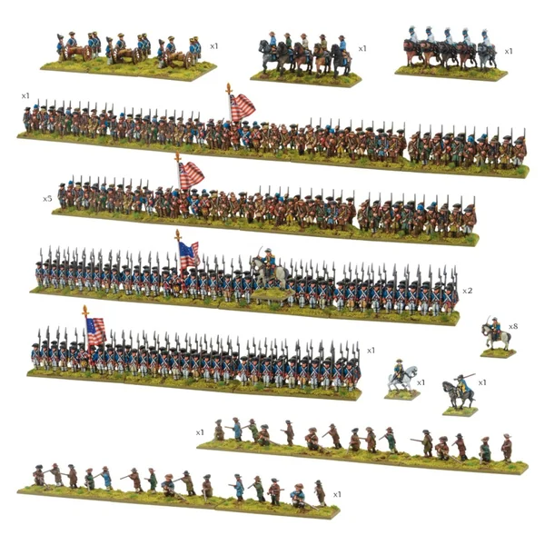 Ce set de bataille impressionnant vous offre tout ce dont vous avez besoin pour rejouer la guerre d’indépendance américaine sur votre table de jeu. Contenant 2 097 soldats (si vous prenez tout en compte, y compris les extras), la boîte vous offre une force énorme pour les Britanniques et leurs alliés Hessois et Amérindiens, et pour l’Armée Continentale Américaine, y compris l’infanterie, la cavalerie et l’artillerie, ainsi que des personnalités célèbres et des commandants « génériques » pour les diriger. Le jeu comprend également un livret de règles A5 complet, des drapeaux pour décorer vos unités, un guide d’assemblage et de peinture, ainsi qu’une tour de guet en MDF pour permettre à vos troupes de se battre !