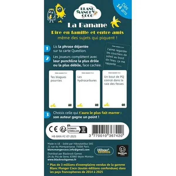 Grâce à des règles expliquées en 1min, on peut se lancer immédiatement dans une partie de Blanc Manger Coco. À l’apéro ou en soirée, c’est le jeu d’ambiance parfait pour rire de tout ! Avec ses 360 cartes, chaque partie est unique. Et pour aller encore plus loin, vous pouvez combiner toutes les boîtes de Blanc Manger Coco entre elles !