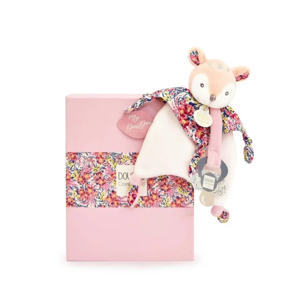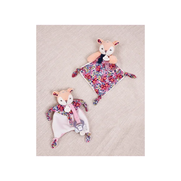 Le Doudou Attache-sucette faon a une jolie frimousse, des matières douces combinées à de fraîches textures, une multitude de nouettes à manipuler et un imprimé exclusif signé DOUDOU ET COMPAGNIE !