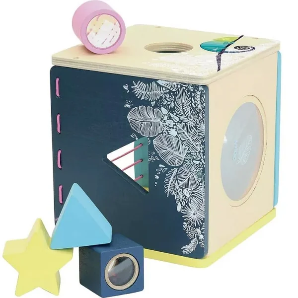 Des jolies pièces en bois à manipuler et à encastrer dans une boite aux couleurs naturelles et pétillantes, pour l’éveil sensoriel des tous-petits. 4 accessoires ludiques pour amuser bébé : cylindre kaléidoscope, cube maracas, étoile et triangle sonore. Dès 1 an.