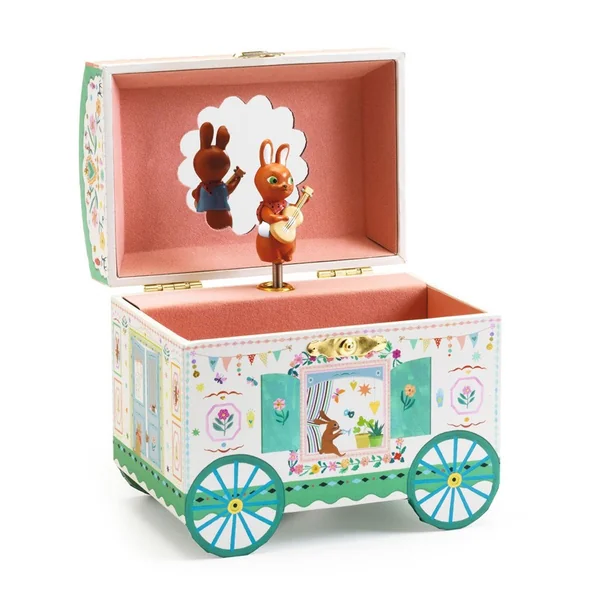 Roulotte enchantée est une boîte à musique en forme de roulotte joliment illustrée pour ranger ses bijoux et secrets. Tournez la manivelle, ouvrez la boîte, et surprise ! Un lapin finement sculpté tourne et se reflète sur un miroir silhouetté au son de la musique « Le temps des cerises » d’Antoine Ronzon.