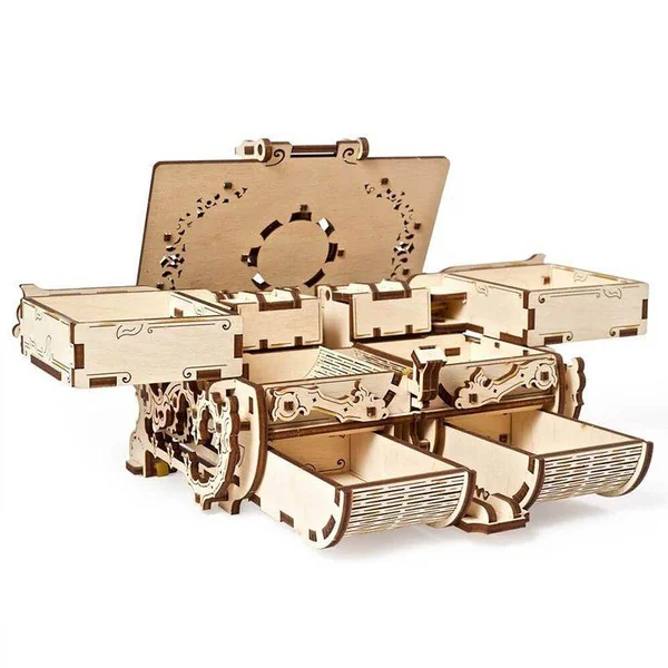En plus de sa belle conception, il garde un beau secret: son mécanisme. Soulevez le couvercle pour activer les trois blocs principaux: deux de ces mécanismes sont inversés et tourneront latéralement les compartiments supérieurs. Le troisième bloc mécanique est le tiroir inférieur au milieu de la boîte.