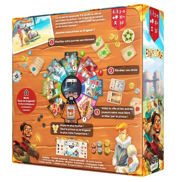 Brigands est un jeu de déduction et de fourberie qui oppose un prince à des bandes rivales de brigands. Le prince doit protéger les coffres de la ville contre les brigands. Si aucun brigand ne réussit à voler 50 Ducats au royaume à la fin des 6 tours de jeu, le prince est victorieux ! Sinon, c’est le brigand le plus riche qui l’emporte.