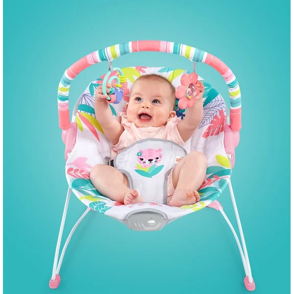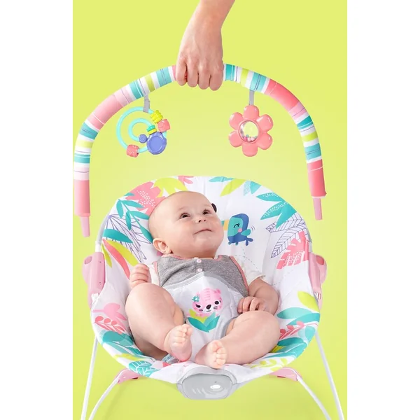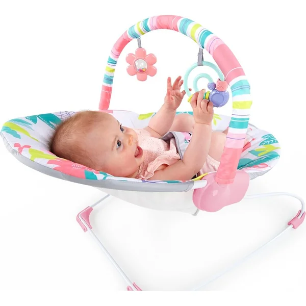 Ce transat rose et joyeux de Bright Starts est une jungle de joie pour vous et votre petite princesse. Profitez ensemble de grands sourires lorsque le bébé s’étirera et jouera avec 2 jouets colorés suspendus à l’arche.