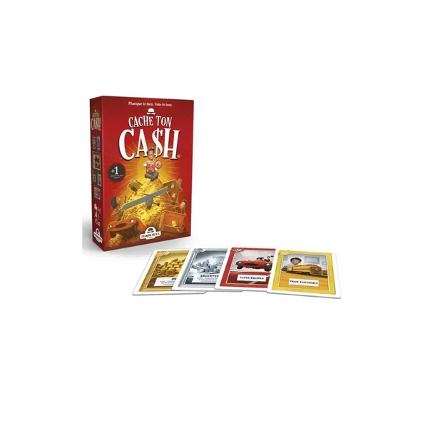 Cache ton cash est un jeu de cartes familial et taquin. Les joueurs doivent garder et protéger des cartes représentant des objets de valeurs et voler celles des autres !