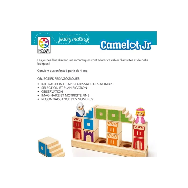 Camelot Jr est un jeu de construction et de logique édité par Smart Games. Le but du jeu est de construire un chemin avec les pièces en bois pour relier le prince et la princesse. Avec 48 défis de niveau évolutif, Camelot Jr vous fera développer votre créativité et votre habileté.