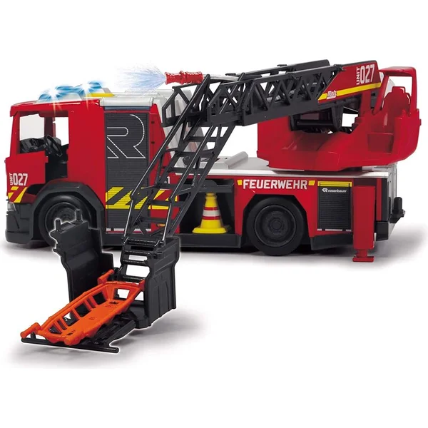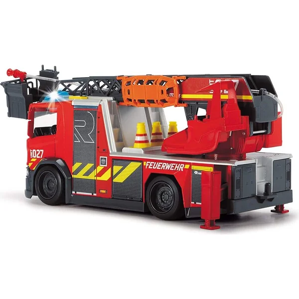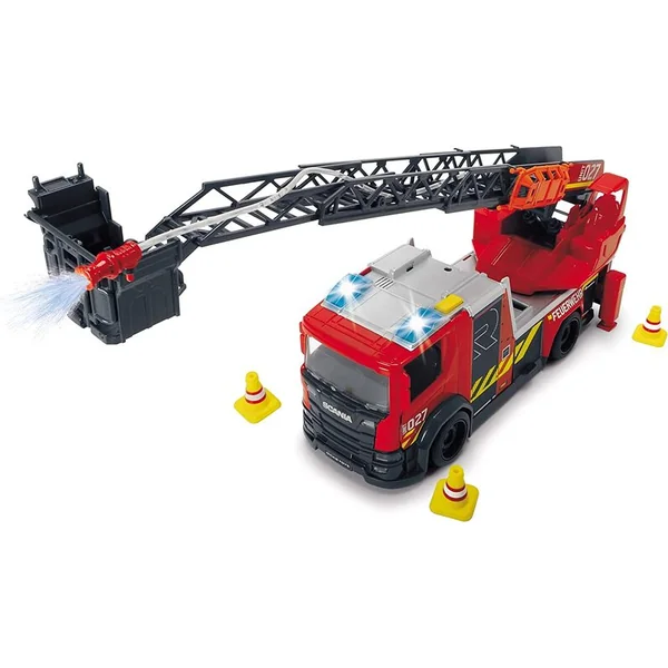 Camion de pompier Scania au ralenti, avec effets lumineux et sonores et fonction de pulvérisation.
