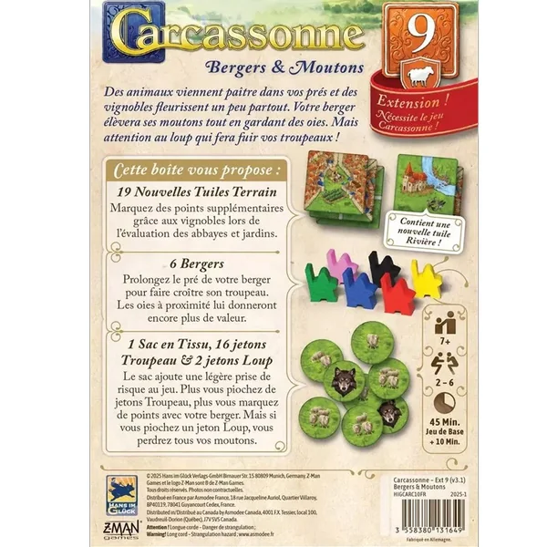 Carcassonne – Extension 9 : Bergers et Moutons nécessite le jeu de base. Information : Attention, présence de petits éléments, risque d’étouffement. Ne convient pas aux enfants de moins de 36 mois. FAQ
