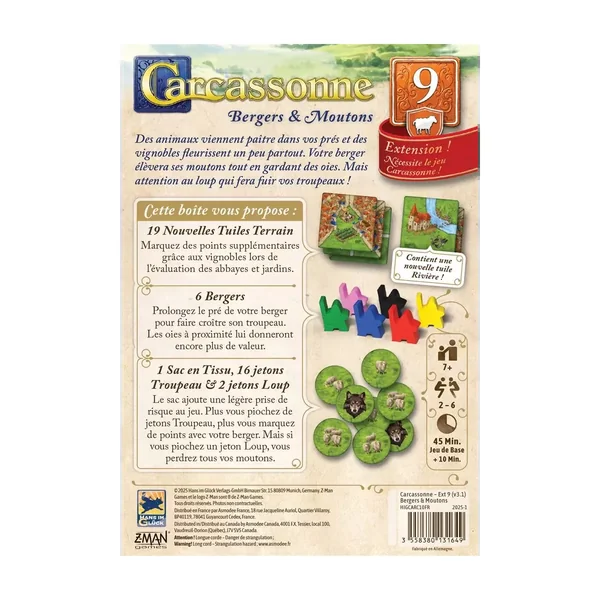 Carcassonne : Bergers et Moutons Édition 2025 est une extension jouable de 2 à 6 joueurs dès 7 ans pour des parties d’environ 45 minutes, édité par Z-Man Games.