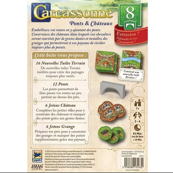 Carcassonne : Extension 8 – Ponts & Châteaux nécessite le jeu de base. Information : Attention, présence de petits éléments, risque d’étouffement. Ne convient pas aux enfants de moins de 36 mois. FAQ