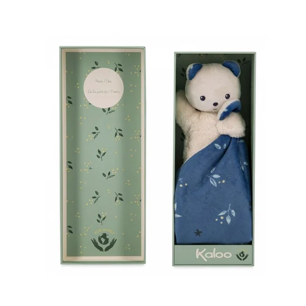 Cet ours lové dans un carré de douceur sera le meilleur compagnon à câliner de bébé. Fait de matières et rembourrage recyclés à partir de bouteilles en plastique, ce doudou est 100% écoresponsable. Avec son petit corps douillet en micro-velours, l’ours est facile à agripper et tenir dans la main de bébé. Le doudou carré qu’il tient entre ses mains est habillé d’un imprimé bleu nuit aux motifs inspirés de la nature. Ce doux imprimé se retrouve dans les oreilles de l’ours et réhausse le tout. Présenté dans un bel écrin, ce dernier peut être réutilisé comme étui de rangement. C’est le cadeau de naissance idéal pour offrir de la douceur 100% « éco-lovely ».