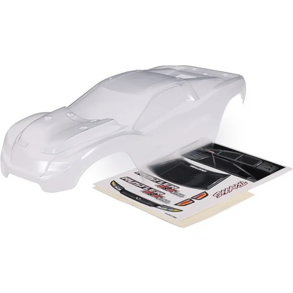 Carrosserie Traxxas Rustler 4×4 transparente – nécessite une peinture, découpée, avec un film de protection appliqué. Les supports de carrosserie, le châssis et l’aileron arrière sont vendus séparément.