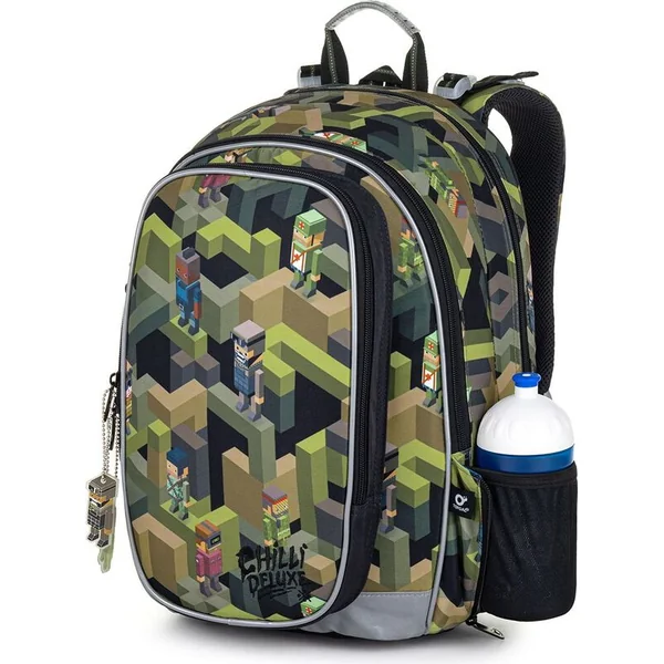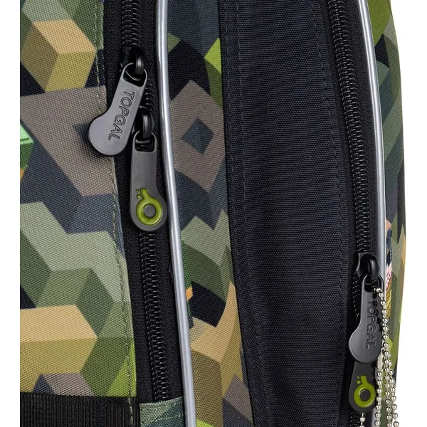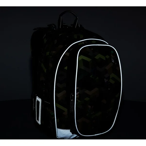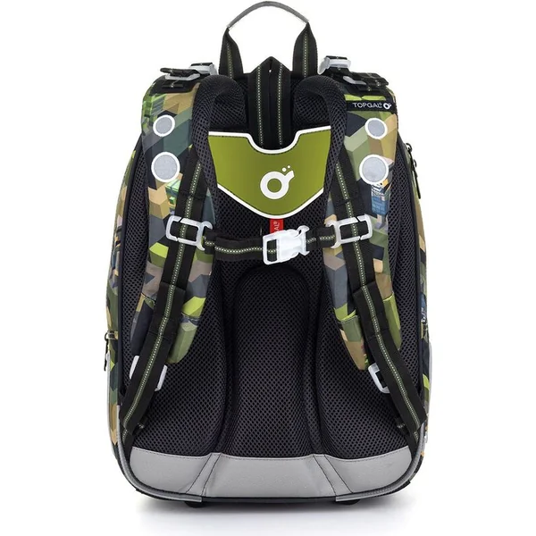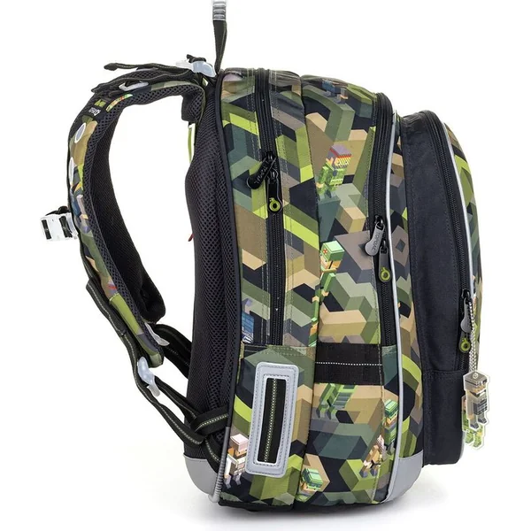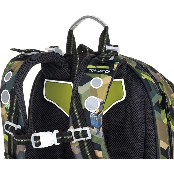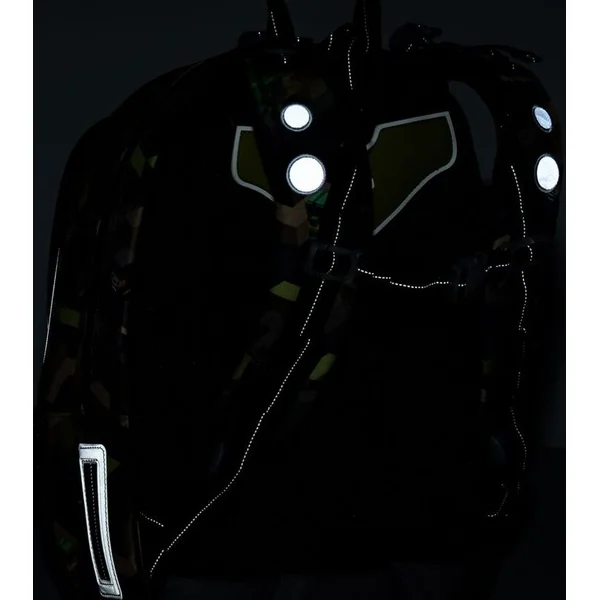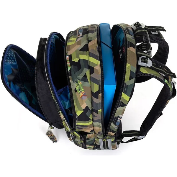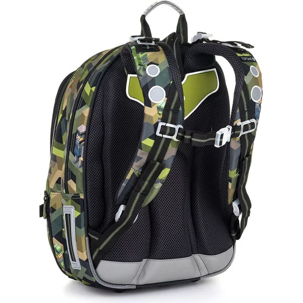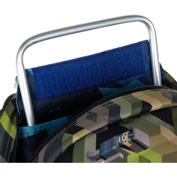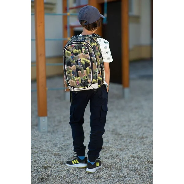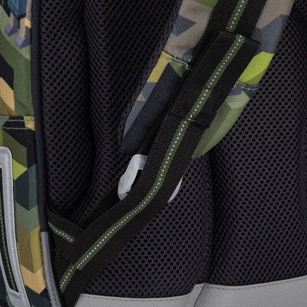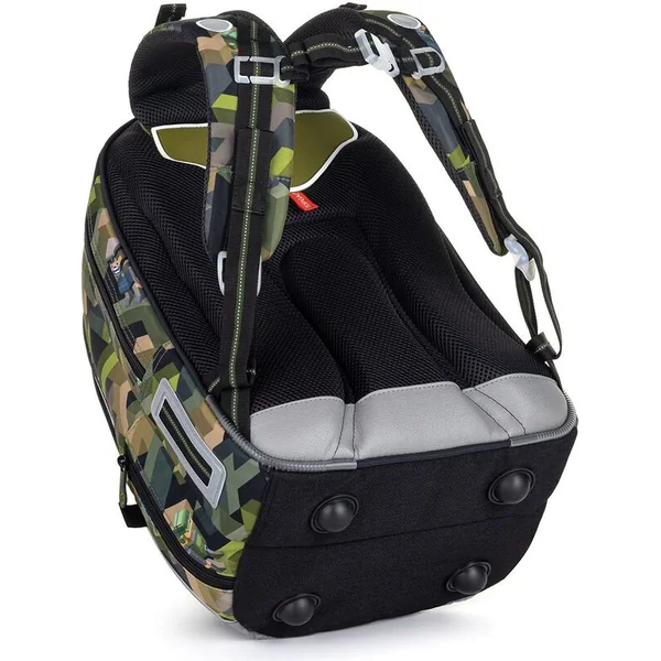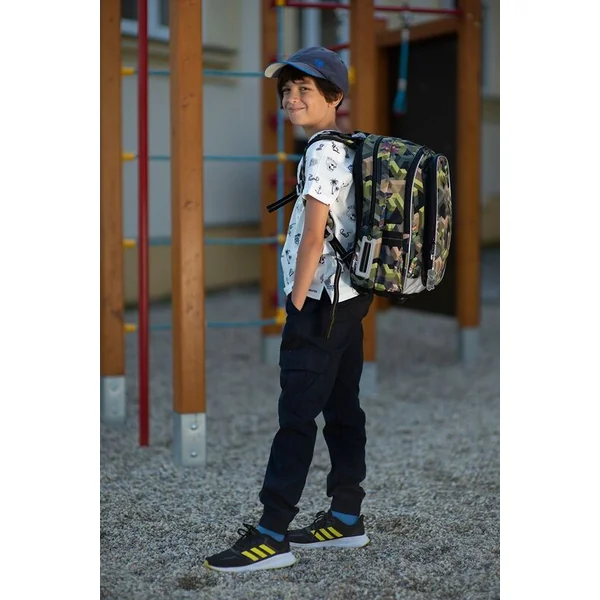 Le dos du sac à dos est rigide, renforcé par un rembourrage anatomiquement formé et un renfort en aluminium. Les bretelles rembourrées sont ergonomiquement conçues et réglables à la fois en bas et en haut. La sangle de poitrine réglable en hauteur garantit que le sac à dos ne glisse pas des épaules, même pour les garçons plus petits.