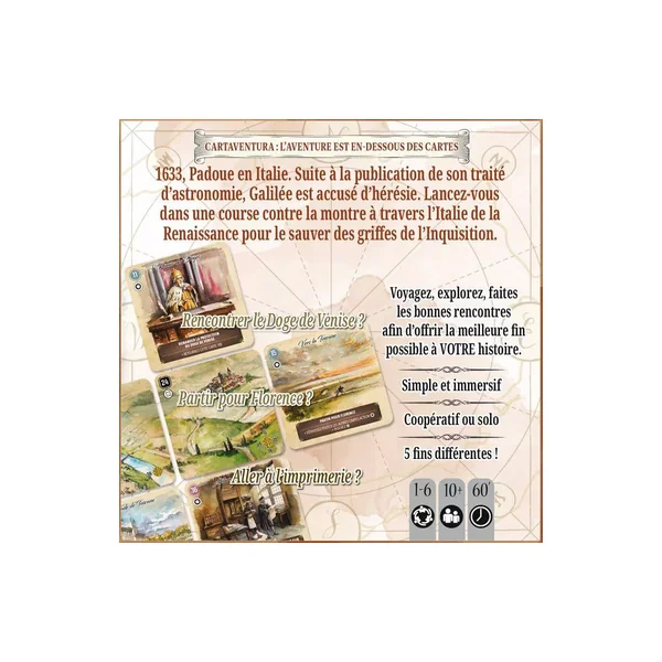 Cartaventura est une collection d’aventures historiques au format poche, façon « Livre dont vous êtes le héros ». À l’aide de cartes qui proposent différentes options, voyagez, explorez et faites les bonnes rencontres afin d’offrir la meilleure fin possible au héros que vous incarnez.
